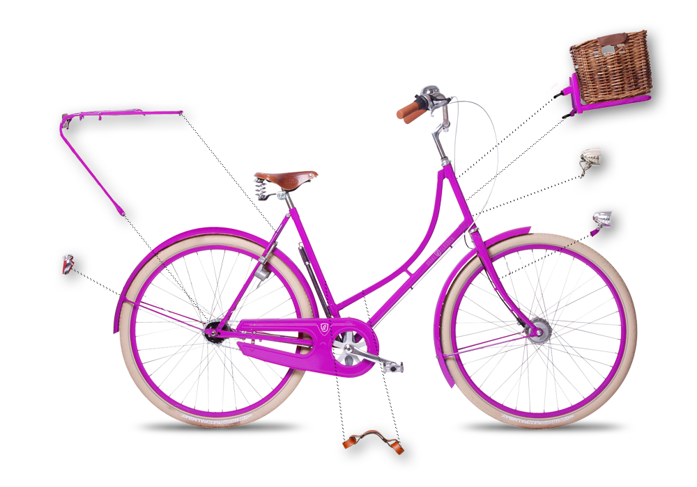 Hier kannst du nicht nur aus der ganzen Farbpalette Deine Wunschfarbe auswählen – Du kannst auch unterschiedliche Farben für Rahmen und Felgen nehmen. Auch unsere Griffe gibt es in sechs unterschiedlichen Farben.